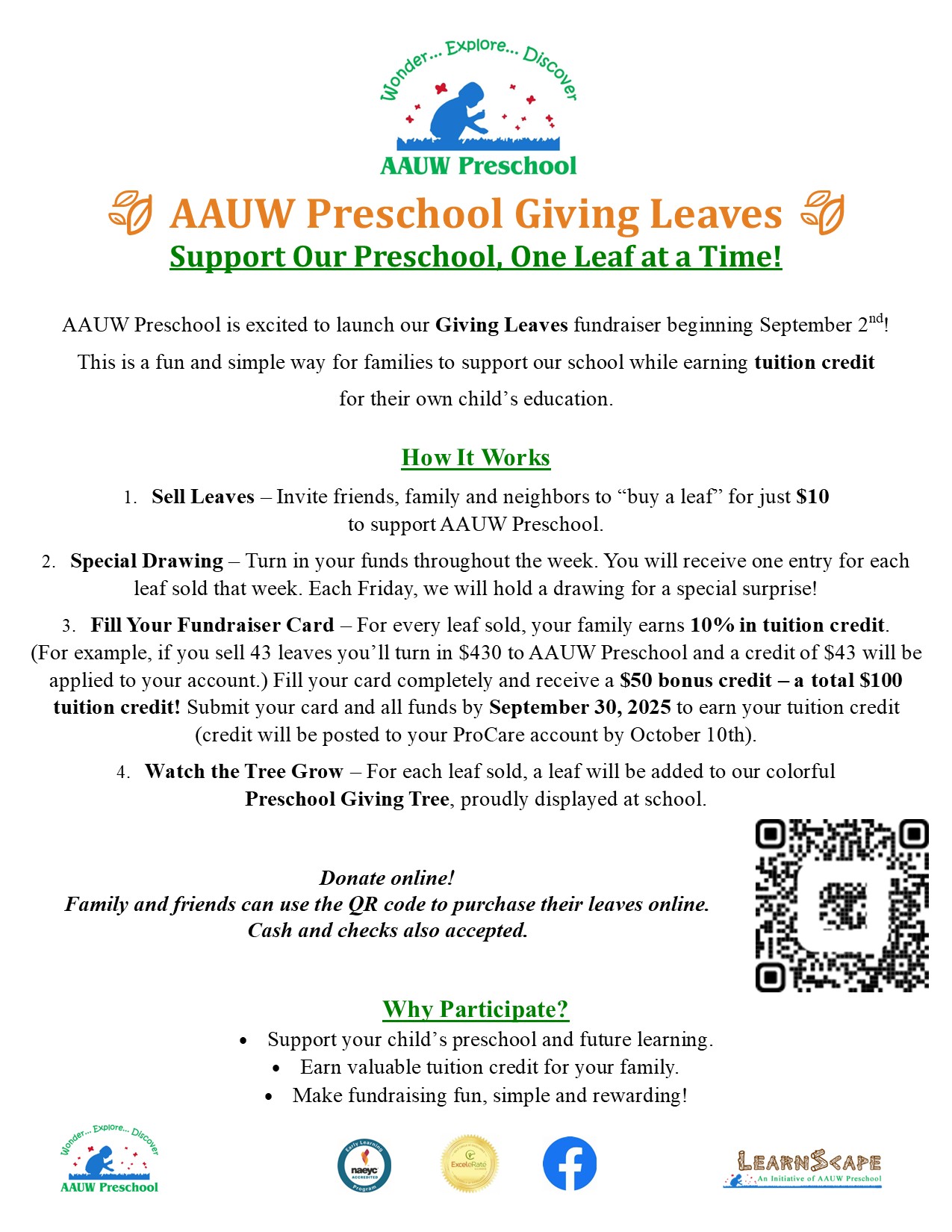 Participate/support “Giving Leaves” by donating on our website: https://www.aauwpreschool.org/support/
