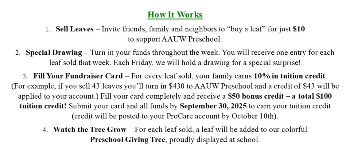 Any AAUW Preschool family who turned in money for the “Giving Leaves” fundraiser this week will receive an entry/entries to this week’s raffle. Money can be dropped off at the office during school hours. All money must be turned in …
